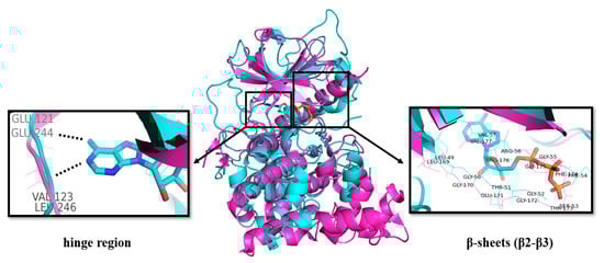 Overlap of the crystal structures of CLK2 (pink, PDB: 3NR9) [43] and PKA with bound ATP (blue, PDB: 1ATP) [44]. Key amino acid residues in the ATP binding region are highlighted by boxes.