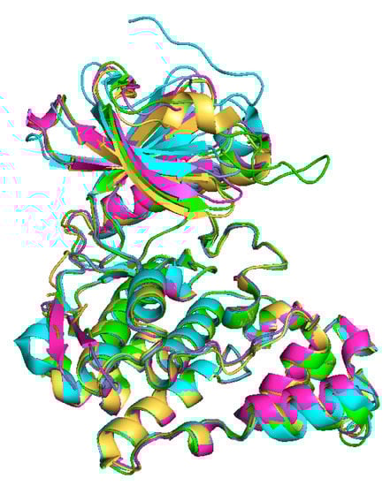 Overlay of X-ray crystal structures: CLK1 (yellow, ligand:12h, PDB: 6I5H) [47], CLK2 (green, PDB: 3NR9) [43], CLK3 (blue, PDB: 6YTW [48], CLK4 (pink, ligand: CX4945, PDB: 6FYV) [45,49].