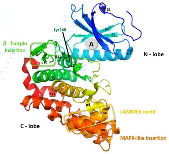 The structures of CLKs contain catalytic domains with β-strands and α-helixes distributed between the N- and C-regions. The N-lobe contains three β-strands followed by α-helix and additional two β-strands (Figure 3) [39,45].