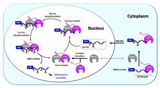 Not only nuclear import but also nuclear function has been described most thoroughly for the CLK1 isoform, namely its regulation mechanism of the SR protein SRSF1 [55,68,85,86]. In this process, CLK1 and SRPK1 work co-operatively as a complex [55]. The complex containing CLK1 in active form first recruits hypo-phosphorylated SRSF1 from nuclear speckles (also termed interchromatin granule clusters), which act as a pool of SR proteins in the nucleus, whereby a ternary complex CLK1-SRPK1-SRSF1 is formed (Figure 6). The ternary complex executes full phosphorylation of SRSF1 and subsequently releases it (Figure 6) [55,84,85]. Alternatively, CLK1 itself can form a complex with SRSF1 and catalyze full phosphorylation first. Subsequently, SRPK1 can engage to create the ternary complex CLK1-SRPK1-SRSF1 [85]. The interaction between CLK1 N-terminus and SRPK1 kinase domain holds the complex CLK1-SRPK1 together but also facilitates the release of hyper-phosphorylated SRSF1 from the ternary complex, which is a prerequisite for the assembly of spliceosome [55]. It has been also suggested that the interaction between CLK1 and SRPK1 anchors the SRPK1 in the nucleus, thereby increasing SRPK1 concentration in the nucleoplasm [55]. In addition, CLK1 phosphorylates the splicing factor SPF45 (non-SR protein) on eight serine residues, regulating cell migration and invasion (SPF45 overexpression promotes both processes) [87].