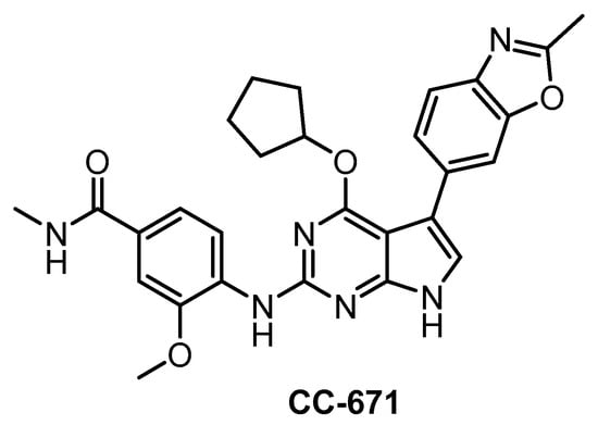 Some kinases (e.g., BCR-ABL, BTK, AKT, VEGFR, etc.) have been established as attractive targets for pharmacological inhibition for a relatively long time [10,11] while others, with the increasing knowledge of the cellular mechanisms, have come to the forefront only recently [11,12,13,14].