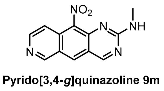 - Tazarki, H.; Zeinyeh, W.; Esvan, Y.J.; Knapp, S.; Chatterjee, D.; Schröder, M.; Joerger, A.C.; Khiari, J.; Josselin, B.; Baratte, B.; et al. New Pyrido[3,4-g]Quinazoline Derivatives as CLK1 and DYRK1A Inhibitors: Synthesis, Biological Evaluation and Binding Mode Analysis. Eur. J. Med. Chem. 2019, 166, 304–317. [Google Scholar] [CrossRef] [PubMed]