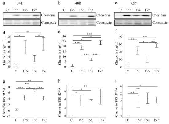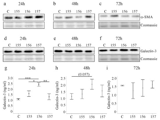 Alpha-smooth muscle actin (α-SMA) and galectin-3 in LX-2 cells expressing chemerin isoforms. (a–c) LX-2 cells were transfected with an insertless plasmid (C) and plasmids to express huChem-155, 156 and 157. Cellular α-SMA was analyzed by immunoblot at 24, 48 and 72 h post-transfection. Coomassie stained membrane served as control; (d–f) Galectin-3 in the cells described in a–c; (g–i) Galectin-3 in the cell media of LX-2 cells described in a–c. N = 3; * p < 0.05, ** p < 0.01, *** p < 0.001, the number in (h) in brackets is the p-value.