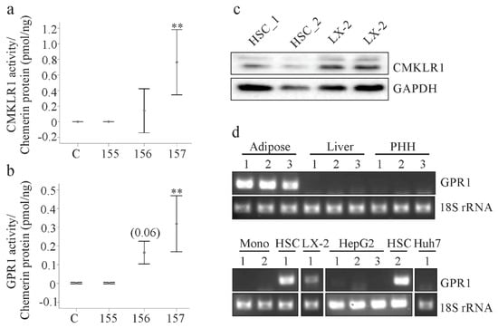 Myofibroblasts are central players in organ fibrosis and chemerin released by these cells functions as a chemoattractant for tumor cells [,]. The autocrine/paracrine effects of chemerin on myofibroblasts are less well understood. Hepatic stellate cells express both functional chemerin receptors. This was shown for CMKLR1 in a previous study [] and for GPR1 in the present analysis although only mRNA expression has been analyzed to date. Thus, these cells are likely responsive to chemerin. It should be noted that GPR1 mRNA was detected in LX-2 cells, primary HSCs and adipose tissues, the latter of which served as a positive control. Primary human hepatocytes and monocytes did not express GPR1 mRNA. These findings are in agreement with previous reports showing expression of GPR1 in fat tissues and myofibroblasts and a lack of GPR1 in monocytes [,,]. CMKLR1 is expressed on hepatocytes and hepatic Kupffer cells, which represent liver resident macrophages []. The physiological and pathophysiological relevance of the more restricted expression of GPR1 in liver cells needs further research.