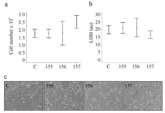 Chemerin isoform effects on cell proliferation, lactate dehydrogenase and cell morphology. (a) LX-2 cells were transfected with an insertless plasmid (C) and plasmids to express huChem-155, 156 and 157. Cell number was counted at 48 h post-transfection (n = 3); (b) Lactate dehydrogenase (LDH) in the supernatants of the cells described in a (n = 4). (c) Morphology of the transfected cells.