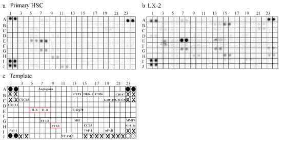 Secretome of HSC and LX-2 cells. (a) Hybridization of the human Cytokine Array with supernatant of primary human HSC; (b) Hybridization of the human Cytokine Array with supernatant of LX-2 cells; (c) Template of the Array: Black circles are the reference spots. White circles are negative controls and X marks positions where no antibodies were spotted. The names of the soluble factors detected by either array are given at the respective position of the Cytokine Array. Proteins, which were further analyzed by ELISA, are in red boxes.