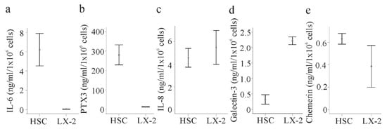 To provide evidence for a differential abundance of some soluble molecules between HSCs and LX-2 cells, these proteins were measured in the media of LX-2 cells and primary HSCs isolated from the liver of three different patients by ELISAs. IL-6 and pentraxin 3 were indeed about 6-fold and 30-fold higher in the primary cells, respectively (Figure 7a,b). IL-8 was nevertheless similar in both cell types (Figure 7c). Galectin-3 (not included in the Cytokine Array) was about 8-fold increased in the supernatants of LX-2 cells compared to the primary HSCs (Figure 7d). Chemerin may be higher in the primary cell supernatant (Figure 7e).