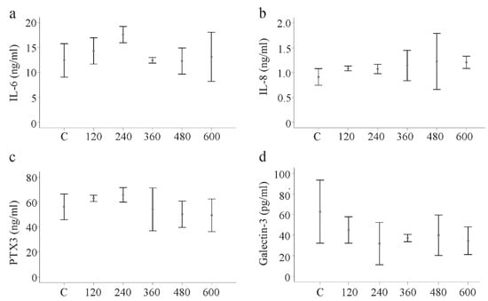 The primary HSCs of three donors were incubated in medium supplemented with recombinant huChem-157 (120, 240, 360, 480 and 600 ng/mL) for 24 h. Analysis of IL-6, IL-8, pentraxin 3 and galectin-3 in the supernatants showed that none of these soluble mediators was impacted by the huChem-157 (Figure 8a–d).