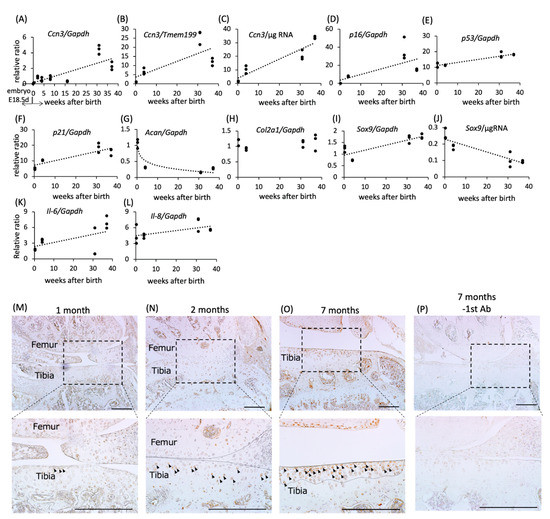 Expression levels of chondrocyte marker genes were also assessed: Aggrecan and type 2 collagen are the major and cartilage-specific components of the extracellular matrix. Postnatal expression of Aggrecan (Acan) mRNA dropped dramatically (rs: −0.73 for Acan/Gapdh, p < 0.01), while no significant age-related changes in Col2a1 expression were observed (Figure 1G,H) in this period. The expression of Sox9, a transcription factor for cartilage differentiation, standardized by Gapdh mRNA increased with age (rs: 0.69 for Sox9/Gapdh, p < 0.01), but decreased when standardized to RNA (rs: −0.88 for Sox9/µg RNA, p < 0.01, Figure 1I,J; see discussion). Senescence-associated secretory phenotype (SASP) -related inflammatory factors such as Il-6 or Il-8 were elevated with age (rs: 0.5670076 for Il-6/Gapdh, and 0.5182002 for Il-8/Gapdh; p < 0.05, Figure 1K,L). Accumulation of CCN3 protein was observed by immunohistochemical staining of CCN3 in knee joint cartilage from one-, two-, and seven-month-old mice. The number of CCN3-positive chondrocytes increased in the superficial zone of seven-month-old articular cartilage (Figure 1M–O). No positive staining was observed without CCN3-specific antibody (Figure 1P).
