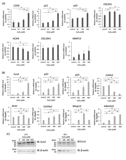 Similarly, in RCS cells, elevated expression of Ccn3, p21, and p53 mRNA was observed. Col2a1 and Acan mRNA were also reduced in a relatively higher concentration of H2O2, however, rather lower concentration of H2O2 increased the expression in RCS cells. Mmp13 and Adamts5 encoding matrix metalloproteinases, which specifically degrade cartilaginous matrices, and Col10a1, a marker of hypertrophic cartilage, which is induced during osteophyte formation, were significantly induced by treatment with H2O2 in RCS cells (Figure 2B, * p < 0.05), however, at highest concentration of H2O2, Mmp13 mRNA was reduced, indicating that the maximum concentration of H2O2 to induce Mmp13 was lower than that for Col10A1 or Adamts5 mRNA in RCS cells.
