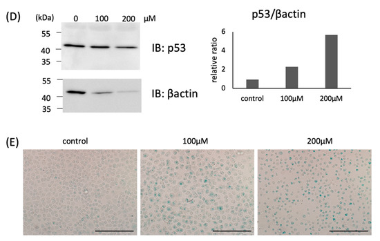 For monitoring SA-β gal activity, the cells were fixed with 4% formaldehyde, and after washing with PBS, the cells were stained with citric acid/sodium phosphate buffer (pH 6.4) containing 5 mM potassium ferricyanate, 5 mM ferrocyanate, 150 mM NaCl, 2 mM MgCl2, 1 mg/mL X-gal for 2 h [43].