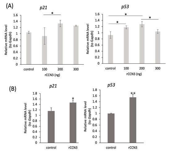 As a result, p21 was used to standardize total amounts of cDNA; in some experiments, transmembrane protein 199 and p53 mRNA expression levels were significantly increased in both mouse primary chondrocytes (Figure 4A) and RCS cells (Figure 4B) by the addition of rCCN3 (* p < 0.05, ** p < 0.01).