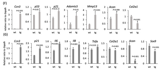 Total RNA was obtained from the cultured primary chondrocytes of embryonic 18.5-day-old ribcages and those from the ribcage and articular cartilage of three-month-old transgenic mice. Even in 18.5-day-old Ccn3 transgenic rib chondrocytes, increased expression of p53, p21, Adamts5, and Mmp13 mRNA, and decreased expression of type II collagen was observed. The Acan expression level increased unexpectedly (Figure 5F, p < 0.01). In three-month-old Ccn3 transgenic articular and ribcage cartilage, p21, inflammatory factors of Il-6, Il-8, and Tnfα were induced; in contrast, Col2a1, Aggrecan, and Sox9 mRNA were downregulated (Figure 5G, p < 0.01). However, p53 mRNA did not show a significant difference (data not shown).