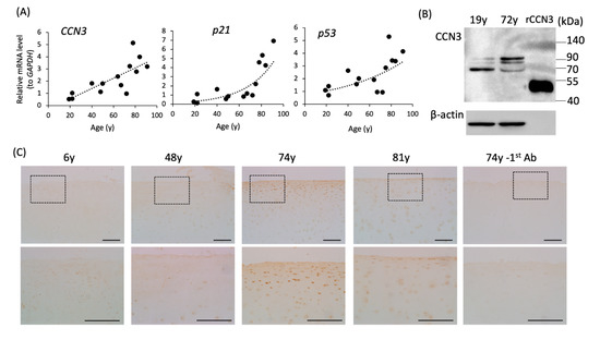 We also analyzed the expression level of CCN3 in human cartilage samples obtained after joint surgery. Cartilage samples were obtained from 14 patients aged 19 to 91 years who were relatively healthy in those years, without osteoarthritic degenerative changes. RT-qPCR analysis of primary cultured chondrocytes from articular cartilage showed a strong positive correlation between age and CCN3, p53, and p21 expression levels (rs: 0.8030808 for CCN3/GAPDH, 0.7018706 for p53/GAPDH, 0.8294835 for p21/GAPDH, p < 0.01, Figure 6A), which is similar to the results in mice (Figure 1). As note, similar to mouse chondrocytes, human articular chondrocytes also showed dramatically decreased GAPDH expression (see supplemental Figure S2). CCN3 mRNA level was also normalized with amount of RNA, and CCN3 mRNA still showed strong positive correlation between age (data not shown). Western blot analysis of cell lysates from 19- and 72-year-old primary articular chondrocytes showed CCN3 bands with different molecular weights (Figure 6B, see also Section 3). Immunohistochemical staining of CCN3 revealed strong positive staining in the superficial layer of femur articular cartilage in 74- and 81-year-old patients (Figure 6C).