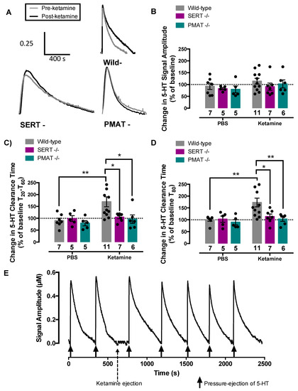 2.3. Ketamine Inhibits Serotonin Clearance in Wild-Type Mice, but Not in SERT−/− or PMAT−/− Mice