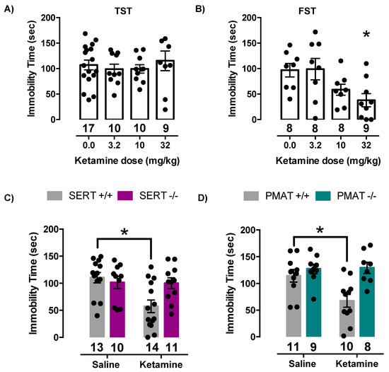 To test the hypothesis that SERT and/or PMAT are necessary for the antidepressant-like effect of ketamine, we measured immobility time in the TST and FST in SERT+/+, PMAT+/+, SERT−/− and PMAT−/− mice. However, first we used wild-type (C57BL/6) mice to confirm, in our hands, that 32 mg/kg ketamine produced robust (near maximal) antidepressant-like effects, as reported by others [16,40,41]. Since the TST is the most used test for antidepressant-like activity in mice, we used this test first. We found that none of the ketamine doses tested (3.2, 10, or 32 mg/kg) produced antidepressant-like effects in wild-type mice (F(3,42) = 0.36, p = 0.78) (Figure 5A). These findings agree with those of others [42].