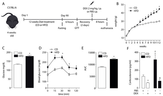 Effect of a high-fat diet on body weight, glucose homeostasis, and corticosterone plasma levels. (A) Study design. (B) Body weight. (C) Fasting glucose. (D) Glucose tolerance test (GTT). (E) GTT area under the curve (AUC). * p < 0.05, unpaired t-test. (F) Corticosterone plasma levels after a dexamethasone injection (DEX; 2 mg/Kg intraperitoneally (i.p.)) or phosphate-buffered saline (PBS). n = 6 mice per condition. Two-way analysis of variance (ANOVA) was conducted, followed by Tukey’s post hoc test. * p < 0.05 vs. CD + PBS, # p < 0.05 vs. CD + DEX, & p < 0.05 vs. HFD + PBS. Values are expressed as mean ± standard error of mean.