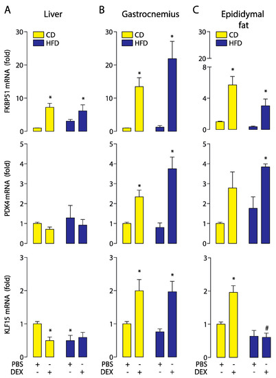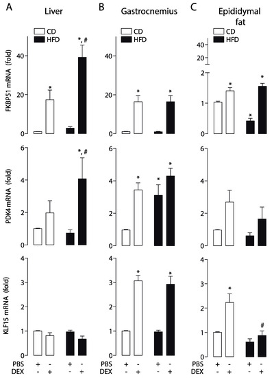 A high-fat diet alters the glucocorticoid receptor (GR) response in a tissue-specific manner. FK506-binding protein 51 (FKBP51), pyruvate dehydrogenase kinase 4 (PDK4), and Krüppel-like factor 15 (KLF15) mRNA levels were determined by qPCR in the liver, gastrocnemius, and epididymal fat obtained from high-fat diet (HFD) or control diet (CD) mice treated with a dexamethasone injection (DEX; 2 mg/Kg i.p.) or phosphate-buffered saline (PBS). (A) mRNA expression in the liver. (B) mRNA expression in the gastrocnemius. (C) mRNA expression in epididymal fat. n = 6 mice per condition. Two-way analysis of variance (ANOVA) was conducted, followed by Tukey’s post hoc test. * p < 0.05 vs. CD + PBS, # p < 0.05 vs. CD + DEX. Values are expressed as mean ± standard error of mean.