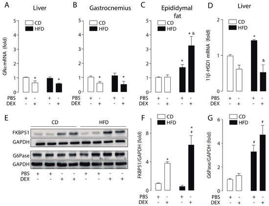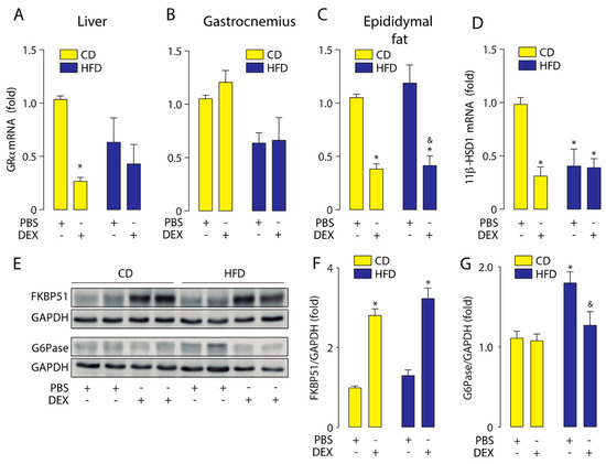 To further investigate how the HFD modulates GC response, we measured GRα mRNA levels in the liver, gastrocnemius, and epididymal fat. Our result shows that dexamethasone reduced the GRα mRNA levels in the liver and gastrocnemius in both HFD and CD mice (Figure 3A,B). In epididymal fat, we found a basal increase in GRα mRNA levels in the HFD group, which was further increased by dexamethasone treatment (Figure 3C). A basal increase in 11β-HSD1 mRNA levels was found in HFD mice liver, and its levels were reduced by dexamethasone (Figure 3D). Under the same conditions, we evaluated liver protein levels of FKBP51 and glucose 6-phosphatase (G6Pase). G6Pase is the key enzyme that regulates the gluconeogenic and glycogenolytic pathways [28]. Liver FKBP51 protein levels showed the same pattern as mRNA, with the increase by dexamethasone being significantly higher in the HFD group (Figure 4E,F). HFD increased basal G6Pase protein levels, but G6Pase mRNA levels did not increase by dexamethasone treatment (Figure 4E,G). These data suggest that HFD-induced obesity triggers a GCs hypersensitivity in the liver.