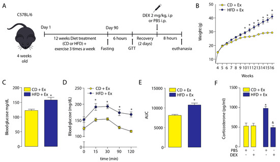 Effects of exercise on body weight, glucose homeostasis, and corticosterone plasma levels in normal and obese mice. (A) Study design. (B) Body weight. (C) Fasting glucose. (D) Glucose tolerance test (GTT). (E) GTT area under the curve (AUC). * p < 0.05, unpaired t-test. * p < 0.05, unpaired t-test. (F) Corticosterone plasma levels after a dexamethasone injection (DEX; 2 mg/Kg i.p.) or phosphate-buffered saline (PBS). n = 6 mice per condition. Two-way analysis of variance (ANOVA) was conducted, followed by Tukey’s post hoc test. * p < 0.05 vs. CD + PBS, & p < 0.05 vs. HFD + PBS. Values are expressed as mean ± standard error of mean.