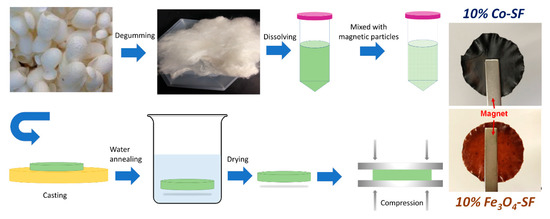 Mori silk cocoons were purchased from Treenway Silks (Lakewood, CO, USA). To remove the sericin coatings, silk cocoons were first degummed as reported previously [10]. An amount of 10 g of silk cocoons was added to 3 L boiling DI water with 6.36 g of NaHCO3 (Sigma-Aldrich, St. Louis, MO, USA). The mixture was kept boiling and stirred for 30 min. The degummed silk fibers were then removed and rinsed in DI water and the water was changed every 20 min for 3 times. The degummed silk fibroin fibers were dried in a vacuum oven overnight. Dried silk fibroin (SF) was dissolved in a formic acid solution with 4% w/v CaCl2 (AMRESCO Inc, Solon, OH, USA) at a concentration of 0.15 g/mL. Silk solution was firstly centrifuged to remove undissolved parts at 5000 rpm for 10 min. BaM (<100 nm, Sigma-Aldrich, St. Louis, MO, USA), Fe3O4 (50–100 nm, Alfa Aesar, Haverhill, MA, USA) and Co (~1.6 µm, Alfa Aesar, Haverhill, MA, USA) particles were added to silk solution at various weight ratios (5%, 10%, 15%, 20% and 30%). More specifically, 5% means that the weight of magnetic particles accounts for 5% of total weight of silk fibroin and magnetic particles. The mixture solution was vortexed for 10 min to disperse the nanoparticles homogeneously throughout the silk solution. The thoroughly mixed solution was cast onto a self-designed polydimethylsiloxane substrate (6-cm diameter circle) and left to dry in fume hood for 24 h (Figure 1). All samples were water annealed in DI water for 30 min. Through this procedure, silk protein chains in composite films gain additional mobility to self-assemble into a more ordered structure with high β-sheet crystallinity. In addition, the remaining formic acid and CaCl2 were removed during the water soaking process. To obtain aligned molecular chains with magnetic particle in the protein matrix, the just annealed wet films were also pressed under 500 kPa for 10 min (Figure 1), with a wet-pressing method [39]. Then, the wet-pressed samples were placed in a vacuum oven at 30 °C for 2 days before testing.