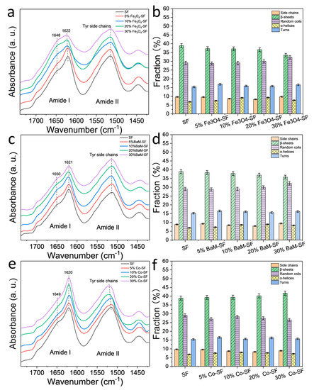 FTIR spectra of (a) Fe3O4-silk fibroin (SF), (c) BaM-SF and (e) Co-SF composite films. Secondary structure contents of (b) Fe3O4-SF, (d) BaM-SF and (f) Co-SF calculated from a Fourier self-deconvolution curve fitting method.