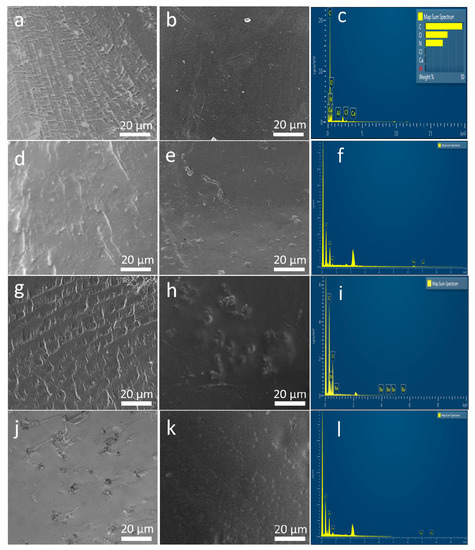 Surface and cross-section morphology of SF and magnetic silk composite films are shown in Figure 3. Lamellar patterns evenly spread out across the cross section of SF and 20% BaM-SF films (Figure 3a,g). Cross section of 20% Fe3O4 (Figure 3d) showed a rougher morphology with wrinkles and densely distributed particles. Cross section of 20% Co-SF (Figure 3j) showed evenly distributed holes with connected wrinkles. When comparing the surface samples to the cross-sectional, the surface seems to be much more homogenous, containing fewer aggregates and wrinkles. SF film shows a smooth and uniform surface (Figure 3b). A 20% BaM-SF sample (Figure 3h) showed a relatively rough surface, and BaM particles distribute homogenously instead of forming big aggregates. Compared to the surface morphology of 20% BaM-SF film, 20% Fe3O4 (Figure 3e) and 20% Co-SF (Figure 3k) films showed smooth and uniform surface morphology with shallow pits. EDS spectra and analyses of the SF, 20% Fe3O4-SF, 20% BaM-SF and 20% Co-SF films are shown in Figure 3c,f,i,l, respectively. As mentioned above, most CaCl2 residue has been washed out of the pure SF film after the water annealing process (Figure 3c). The EDS spectra of various elements in the composites also showed evidence of Fe (6.403 keV and 0.705 keV, Figure 3f), Ba (4.465 keV and 0.779 keV, Figure 3i) and Co (6.929 keV and 0.776 keV, Figure 3l) elements in their respective composite films.