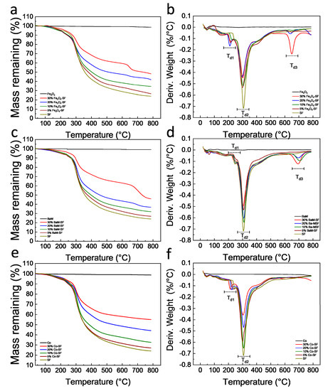 Thermogravimetric curves of (a) Fe3O4-SF, (c) BaM-SF and (e) Co-SF composite films. The 1st derivative TG (DTG) curves of (b) Fe3O4-SF, (d) BaM-SF and (f) Co-SF composite films.