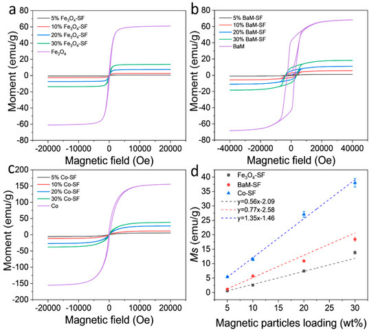Magnetization and hysteresis loops of (a) Fe3O4-SF, (b) BaM-SF and (c) Co-SF composite films at room temperature. (d) Saturation moment of Fe3O4-SF, BaM-SF and Co-SF composite films as a function of the magnetic particle content.