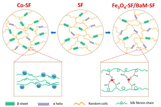 With the experimental evidence and analysis provided above, we can confirm that Fe3O4 and BaM particles can slightly prevent the β-sheet crystal formation, suggesting that the Fe3O4-SF and BaM-SF composite films have more noncrystalline structures (Figure 7). This is probably caused by the strong coordination bonding between Fe3+ ions and carboxylate ions on silk fibroin chains [36,37,38] due to the dissolved Fe found from the magnetization studies. Most β-sheet crystals usually formed during the water annealing and wet pressing process. However, when the Fe3O4 and BaM particles were present, the strong coordination bonding limited the mobility of silk fibroin chain and further prohibited the β-sheet crystal formation (Figure 7). The unique high temperature degradation (Td3) of Fe3O4-SF and BaM-SF samples found in TG analysis may be another indicator of this stable phase, which is formed when Fe is combined with silk protein. On the other hand, the amount of dissolved Co is minimal as compared to that of the Fe, so the addition of Co nanoparticles has less effect on the secondary structure. Since a large amount of Co particles will occupy more space in the Co-SF film, the silk protein chains are able to be closer to each other, resulting in a slight increase in β-sheet crystals (Figure 7).