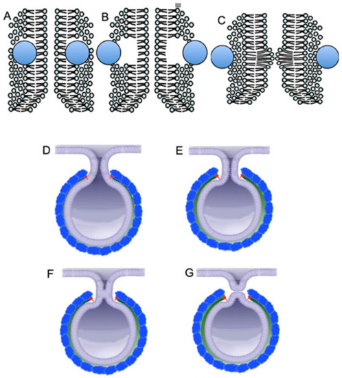 External forces may significantly change the equilibrium membrane shape. For instance, proteins may also affect the local membrane properties as external factors. Membrane-bound proteins such as coatomer (COP) I, COPII, dynamin, clathrin/AP1, clathrin/AP2, AP3, AP4 (reviewed in [26,33,34,35]), with asymmetric distribution of mass across the bilayer, influence membrane bending in a nonspecific manner due to molecular crowding [36]. Shallow hydrophobic insertions and strongly curved protein scaffolds appear to be effective generators of the membrane curvature of intracellular organelles [37]. Curved proteins may bind to the membrane and also impose their curvature onto the membrane [5]. It has been suggested that the binding of crescent-shaped BAR domains to the membrane plays a role in the formation of membrane tubules, and that the resulting spontaneous membrane curvature might depend on the fraction of the membrane surface area covered by BAR [36]. However, insertion of one protein helix would affect the curvature only slightly. In order to increase local curvature significantly, it is necessary to insert several such proteins in one place, and to keep these proteins close to each other, otherwise they will be dissolved within the membrane fluid. Thus, these proteins should be concentrated, by some mechanism, within one place [36]. The curvature of BAR-like domains is often lower [2] than that of most of membrane tubules in the cytosol (Figure 2A). If the curvature of BAR-like domains is lower than that of a membrane tube, the proteins orient from the perpendicular position to a more longitudinal one. The curvature of the projection of its inner surface onto the long axis of the tube (when viewed along the long axis) increases. Finally, the tube becomes so thin that even when this protein is positioned at a very small angle from the long axis of the tube, the curvature of its inner surface to the long axis of the tube becomes too large for this curvature, and the protein detaches from the tube inducing tubule fission (see below) (Figure 2B–G).