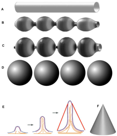 The above-mentioned regularities could be useful for understanding the mechanisms responsible for membrane tube transformation into vesicles through the bead-like tube stage (Figure 4A–D). According to the TAA hypothesis, when the delivery of surface area and curved membrane domains is absent the diameter of formed vesicles will be 2.2-fold larger than the diameter of the original tube. In this way, the breakdown of the cell microvilli, with diameter of 100 nm, into spherical vesicles produced vesicles with a diameter of 198 ± 7 nm [4]. If we take this approach and calculate the diameter of coatomer II (COPII)-dependent vesicles, using data from Bacia et al. [65] as a starting point for this calculation, the diameter of COPII vesicles will be 85 nm. The diameter of vesicles visible within the ER exit sites, and separated from other membranes is 50 nm, whereas the cross diameter of COPII coated buds on the granular ER is about 75 nm [45,66]. Even in the cornerstone paper by Barlowe et al. [67], vesicles do not form after incubation of microsomes with a purified component of COPII. The vesicles appear only after harsh filtration through a gel with narrow pores. This suggests that these 50-nm vesicles are not COPII-dependent.