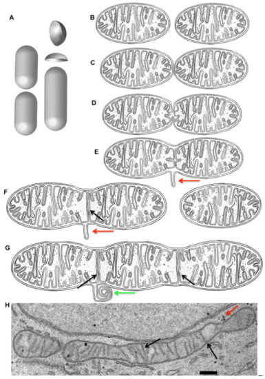 After mitochondria fusion the outer mitochondrial membrane becomes excessive. (A) Surface area of two ovoid figures before and after their fusion. Two half-spheres are excessive. (B–G) Stages of two consecutive mitochondria fusions. The fusion leads to the formation of excess of the surface area of the outer mitochondrial membrane, with the formation of the membrane protrusion (red arrow), which is then transformed into the multi-lamellar organelle (green arrow). Immediately after mitochondrial fusion the wall between the two mitochondria matrix compartments, derived from two mitochondria, is preserved (black arrows in F,G). (H) Example of long mitochondrion with such walls (black arrows). Thus, a mitochondrion formed after several consecutive fusions contains one or several partition walls (black arrows). Bar: 280 nm (H).