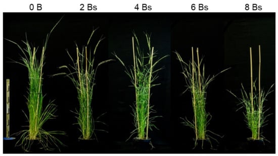 Ae. speltoides plants with an increasing number of B chromosomes. Vegetative growth is affected for plants owing more than 4 Bs.
