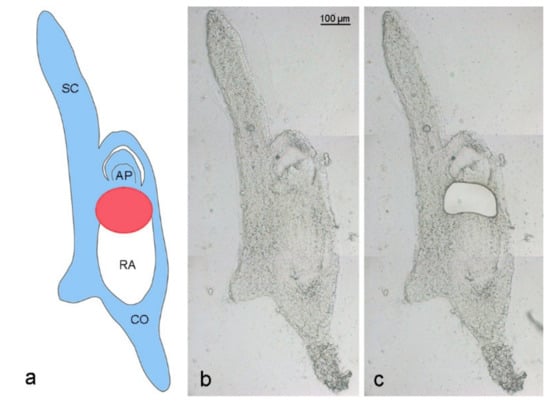 Laser capture microdissection of an Ae. speltoides embryo. (a) Schema is depicting an embryo with B chromosomes at the stage of 17 days after anthesis. Blue color indicates embryo parts containing Bs, white color shows the absence of Bs in the radicle. The red circle marks the region of ongoing Bs elimination between the apical meristem and developing radicle. SC—scutellum, AP—apical meristem, RA—radicle, CO—coleorhiza. Cryosection of a 17 DAA embryo (b) before and (c) after laser dissection of the region where Bs undergo elimination.