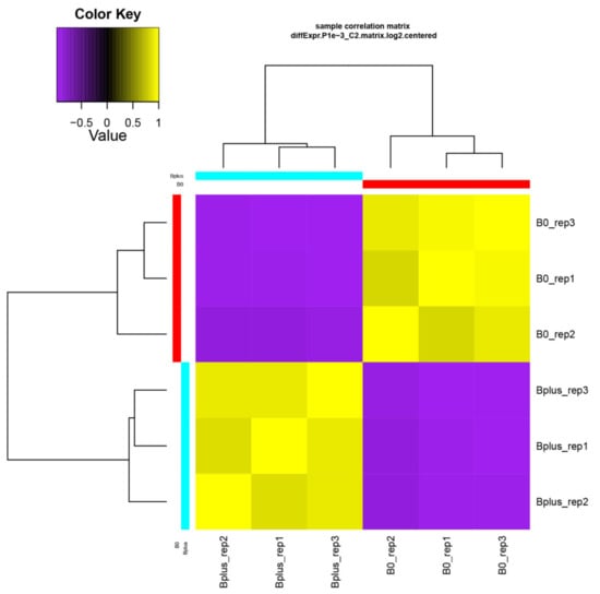 A de novo transcriptome assembly based on Trinity was applied since Ae. speltoides represents a non-model organism that contains in addition a high proportion of heterozygous loci. Trinity is highly effective for reconstructing transcripts and alternative spliced isoforms [], and it allowed a better understanding of which transcript isoforms are truly expressed under a specific condition such as elimination of Bs. The de novo transcriptome assembly resulted in B0 and Bplus FASTA files containing 165,818 and 196,360 contigs, respectively. Subsequent filtering resulted in 117,441 contigs for downstream analysis (N50 contig size of 1026 bp). Detailed information about the assembly statistics is given in Table S2, Supplementary Materials. Transcriptome profiles of Ae. speltoides were evaluated at the transcript isoform expression level and quality was checked with the script PtR. A correlation matrix and PCA confirmed biological replications (Figure 3, Figure S1, Supplementary Materials).