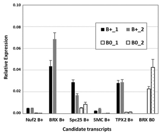 To verify RNA-seq data, reverse transcription quantitative PCR (RT-qPCR) was performed with a subset of transcripts known to be involved in cytokinesis and microtubule organization, similarly found to be B0- or Bplus-specific (Figure 5). The kinetochore gene Nuf2 (nuclear filament-containing protein), Bplus-specific BREVIS RADIX (BRX), a regulator of cell proliferation and elongation in the root and shoot, SMC2, a component of the chromosome condensin complex, and TPX2, encoding a Xklp2-targeting protein, showed nearly no expression in the meristematic region of B0 embryos. Preferential expression in that cellular region of Bplus embryos was also shown for the chromosome segregation protein SPC25, whereas B0-specific expression was confirmed for a different isoform of BRX. Transcript levels and similar expression differences between candidate transcripts obtained by RT-qPCR validated the quality of the RNA-seq data analysis.