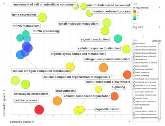 Gene ontology (GO) enrichment analysis of genes with statistically significant up-regulated changes during B chromosome elimination. REVIGO was used to summarize and visualize the enriched GO terms related to biological process. Circles depicted by filled color show significantly enriched GO terms with log10 p-value < 0.05. Similar GO terms are grouped based on semantic similarity.