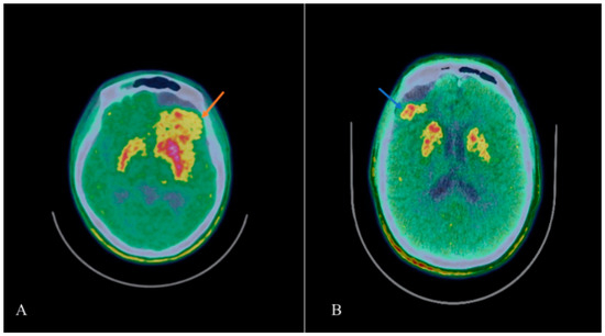 (A) [18F]FDOPA PET/CT image of patient #3 (III grade oligondendroglioma, O⁶-methylguanine-DNA methyltransferase promoter (MGMTp) methylated, and isocitrate dehydrogenase (IDH) mutant) demonstrates an area of pathologic accumulation of the tracer in the left frontal lobe (orange arrow, SUVmax 3.2) with the involvement of the ipsilateral striatum. (B) [18F]FDOPA PET/CT image of patient #27, II grade astrocytoma, MGMTp methylated, and IDH1 wild type shows an area of pathological uptake of the radiopharmaceutical (blue arrow, SUVmax 2.9) in the posterior region of the surgical cavity, localized in the right frontal lobe.