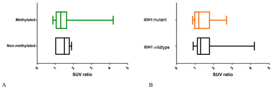 Box-plots showing no statistical differences in (A) [18F]FDOPA uptake between patients with methylation of O⁶-methylguanine-DNA methyltransferase promoter (MGMTp) and patients with no methylation of MGMTp (p = 0.15) and (B) between patients isocitrate dehydrogenase 1 (IDH1) mutant and IDH1 wild-type (p = 0.79).