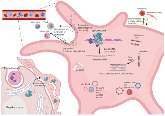 Nucleic acids landscape of platelets. Platelets harbor a diverse set of RNA species, most of which are inherited from megakaryocytes. Additionally, communications with surrounding cells might also influence RNA expression landscape. Transport of RNA from megakaryocytes to platelets is not well understood, however, is suggested to be—at least in part—mediated by RNA-binding proteins (RBPs). Pre-mRNA and pre-miRNA are processed by a functional spliceosome and by the presence of the cytoplasmic miRNA processing into translate mRNA and mature miRNA, respectively, which can be signal-dependent. Platelets may also host infectious virus particles and mediate dissemination of viruses in infected individuals. By secreting RNA and protein contents by platelet granules or microvesicles, platelets may regulate signaling pathways in various interacting cells, including tumor or endothelial cells.