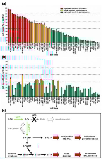 Tumor cell lines of the NCI-60 panel (n = 54) infected with the virotherapeutic compound GLV-1h94 without (A) and with (B) addition of the prodrug 5-fluorocytosine (5-FC). (a,b) At 96 h post infection, tumor cell masses were analyzed via sulforhodamine B (SRB) assay. Bars in red indicate a remnant tumor cell mass of more than 75% (in comparison to mock-infected cells) and thereby define a “high-grade resistance” to GLV-1h94-mediated oncolysis; bars in orange denote remaining tumor cell masses in the range of 50–75%, defining a “partial permissiveness” to oncolysis by GLV-1h94; bars in green specify a remaining tumor cell mass of less than 50%, categorized as “high-grade permissiveness” to GLV-1h94-mediated oncolysis. Mean ± SD of three independent experiments are shown. Thresholds (100%, 75%, 50%) are indicated by dotted lines. (c) Overview of the 5-FC conversion system (employing enzymes YCD + YUPRT). dUMP: deoxyuridine monophosphate; TS: thymidylate synthase; dTMP: deoxythymidine mono-phosphate; dTTP: deoxythymidine triphosphate; 5-FdUMP: 5-fluorodeoxyuridine mono-phosphate; 5-FUMP: 5-fluorouridine monophosphate; 5-FUTP: 5-fluorouridine triphosphate; 5-FC: 5-fluorocytosine; YCD: yeast cytosine deaminase; 5-FU: 5-fluorouracil; UDK: uridine kinase; UDP: uridine phosphorylase; YUPRT: yeast uracil phosphoribosyltransferase; DPD: dihydro-pyrimidine dehydrogenase; FbAL: 5-fluoro-ß-alanine. Scheme modified from [].