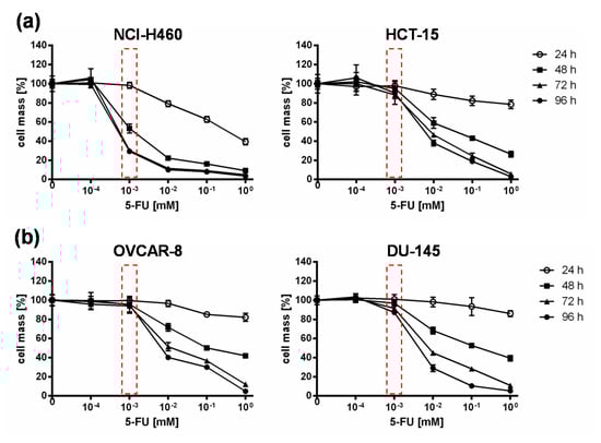 5-fluorouracil (5-FU) sensitivity of two “high-grade resistant” ((a); NCI-H460, HCT-15) and two “high-grade permissive” ((b); OVCAR-8, DU-145) tumor cell lines. All tumor cell lines were treated with different concentrations of 5-FU (10−4, 10−3, 10−2, 10−1, 1 mM) and cell masses were analyzed at 24, 48, 72, and 96 h via SRB assay. Mean ± SD of two independent experiments are shown. Red boxes indicate relevant differences in responsiveness to 5-FU between all cell lines at a concentration of 10−3 mM 5-FU at which the greatest difference between the tested cell lines with respect to tumor cell masses was observed.