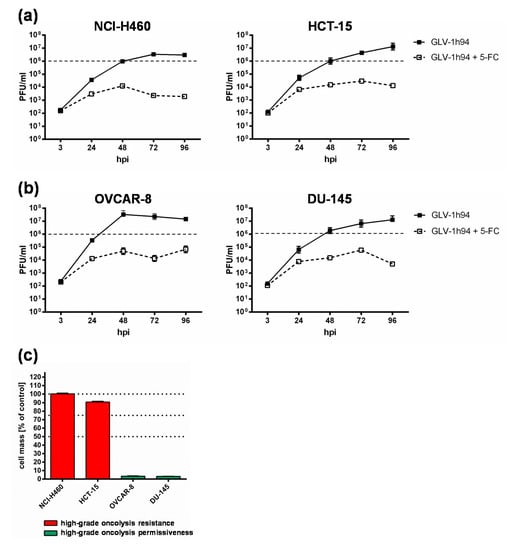 Replication of GLV-1h94 in two “high-grade resistant” ((a); NCI-H460, HCT-15) and in two “high-grade permissive” ((b); OVCAR-8, DU-145) tumor cell lines alone and after the addition of the prodrug 5-fluorocytosine (5-FC). (a,b) All four tumor cell lines were infected with GLV-1h94 at MOI 0.1. At 3 hpi, 5-FC [0.1 mM] was added and replication was analyzed via plaque assay at 3, 24, 48, 72, and 96 hpi. (c) Remaining cell masses of NCI-H460, HCT-15, OVCAR-8, and DU-145 tumor cells measured via SRB assay at 96 hpi with GLV-1h94 (MOI 0.1). Mean ± SD of two independent experiments are shown. Dashed lines indicate a virus concentration of 106 PFU/mL to better illustrate differences between the analyzed cell lines. PFU: plaque-forming units; MOI: multiplicity of infection; hpi: hours post infection with GLV-1h94.