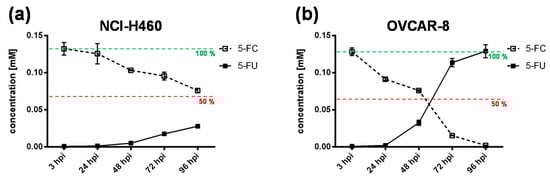 As expected, the conversion rates in both cell lines differed greatly from each other. Accordingly, the conversion rate in NCI-H460 cells at 96 hpi was below 50% (Figure 4a), whereas, at the same time, a conversion rate of 100% was detected in OVCAR-8 cells (Figure 4b). These findings correlate directly with the results of the infection and cell mass studies of the NCI-60 panel (Figure 1a, b) as well as with the 5-FU sensitivity testing (Figure 2). The cell line NCI-H460 displayed a very high resistance to GLV-1h94-mediated oncolysis with nearly 100% remaining cell mass after infection with GLV-1h94 alone at 96 hpi (Figure 1a). Therefore, it can be assumed that only a few cells are infected and only a small amount of SCD is produced. This lack of prodrug-converting enzyme in turn means that little 5-FC can be converted to 5-FU, which explains the conversion rate of less than 50% (Figure 4a). However, NCI-H460 cells responded very efficiently to the combination of viro- and chemotherapy with a remaining cell mass of 5% after prodrug activation (Figure 1b). This effect can be explained by the cell line’s very pronounced sensitivity to 5-FU (Figure 2), indicating that the conversion rate of 5-FC to 5-FU is still high enough to result in massive chemotoxic tumor cell lysis. In contrast, OVCAR-8 is a “high-grade permissive” cell line (3% remaining cell mass 96 hpi with GLV-1h94; Figure 1a), which is why a large number of cells are initially infected and, therefore, a large amount of prodrug-converting enzyme is expressed in the cells. Hence, the added 5-FC was completely converted into 5-FU and a conversion rate of 100% (Figure 4b) was measured, which confirms that the conversion rate depends on the cell line-specific infection rate of GLV-1h94. Since a large number of cells are already initially infected and OVCAR-8 cells are less sensitive to 5-FU, the large amount of converted 5-FU does not cause an additional cytotoxic effect. It rather seems that in this context 5-FU has a negative influence on viral replication due to its function as a thymidylate synthase inhibitor, which would explain the slight increase in cell mass 96 hpi after combination therapy (15% remaining cell mass; Figure 1b).