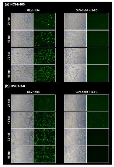 Fluorescence images of the “high-grade resistant” tumor cell line NCI-H460 (a) and the “high-grade permissive” tumor cell line OVCAR-8 (b) infected with GLV-1h94 ± prodrug 5-fluorocytosine (5-FC). Both tumor cell lines were infected with GLV-1h94 at MOI 0.1. At 3 hpi, 5-FC [0.1 mM] was added and brightfield (left panels) as well as fluorescence images (right panels) were taken at 24, 48, 72, and 96 hpi. Images were taken with a Leica DMi8 microscope equipped with a DMC 4500 camera, original magnification 50×.