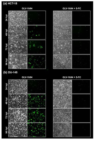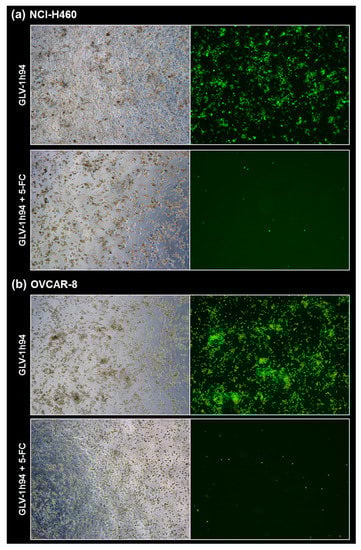 When observing the “high-grade permissive” cell lines OVCAR-8 (Figure 5b, left panel) and DU-145 (Figure 7b, left panel), it was found that infection with GLV-1h94 alone leads in both cell lines to a massive GFP expression starting at 24 hpi which increases until 96 hpi. In addition, a progressive destruction of both OVCAR-8 and DU-145 cell layers could be observed (Figure 5b and Figure 7b, left panel). These microscopic images, especially the close-ups of the 96 hpi time points (Figure 6b, upper panel; Figure 8b, upper panel), confirm that both cell lines are “high-grade permissive” cell lines, in which an increase in GLV-1h94 virus replication also led to efficient oncolysis. Surprisingly, when adding 5-FC to the infected cells, no GFP expression and, therefore, reduced viral infection could be observed at 24 hpi and throughout the entire course of infection as in NCI-H460 cells (Figure 5b and Figure 7b, right panel). Interestingly, when looking at the close-ups of the 96 hpi time points, both the OVCAR-8 as well as the DU-145 cell layers were significantly less destroyed than after GLV-1h94 monotherapy (Figure 6b and Figure 8b, lower panel). These results suggest that in both “high-grade permissive” cell lines, compared to the “high-grade resistant” cell line NCI-H460, the primary infection rate is high, resulting in high amounts of prodrug convertase. Therefore, added 5-FC is completely converted to 5-FU, thus achieving high levels that could actually inhibit cell proliferation. However, both OVCAR-8 and DU-145 are cell lines with low 5-FU sensitivity, so it can be speculated that the high 5-FU concentrations in these specific cell lines directly inhibit virus replication (as reflected by a lack of GFP expression) rather than cell proliferation.