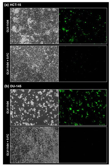 Fluorescence images of the “high-grade resistant” tumor cell line HCT-15 (a) and the “high-grade permissive” tumor cell line DU-145 (b) infected with GLV-1h94 ± prodrug 5-fluorocytosine (5-FC). Both tumor cell lines were infected with GLV-1h94 at MOI 0.1. At 3 hpi, 5-FC [0.1 mM] was added and brightfield (left panels) as well as fluorescence images (right panels) were taken at 96 hpi. Images were taken with an Olympus IX50 microscope equipped with an F-view Soft Imaging System camera, original magnification 40×.