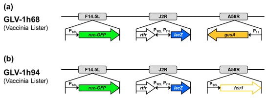 In this study, the vaccinia virus construct GLV-1h94, which was kindly provided by Genelux Corporation, San Diego, CA, USA, was used. GLV-1h94 (Figure 9b) is a derivative of the previously described virus construct GLV-1h68 (Figure 9a) []. Both constructs were originated from the Lister strain of vaccinia and were generated by homologous recombination of foreign genes into target loci of the VACV genome through double reciprocal crossover. In GLV-1h94, the gene locus for F14.5L was deleted by insertion of the fusion protein consisting of Renilla luciferase and Aequorea green fluorescent protein (ruc-GFP) under control of a vaccinia synthetic early/late promoter (PSEL). Furthermore, the gene locus for thymidine kinase (J2R) was deleted by insertion of ß-galactosidase (lacZ; under control of the vaccinia early late promoter (P7.5)) and genes for human transferrin receptor (TFR; under control of the synthetic PSEL promoter), which allows for the detection of virus-infected cells at the protein level. Finally, the gene cassette A56R (encoding for hemagglutinin), which was deleted by insertion of ß-glucuronidase (gusA) in GLV-1h68, was replaced by the suicide gene fcu1 under control of PSEL. The expression of the converting enzyme SCD enables the transformation of 5-FC into 5-FU, which leads to RNA miscoding and direct inhibition of DNA synthesis.