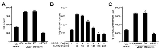 HPV16 E6 facilitates vascular endothelial growth factor (VEGF)-induced endothelial cell migration, proliferation and tubular network formation in vitro. (A,B) Boyden chamber-based migration assays were conducted to determine whether the transfected HPV16 E6 regulates the effects of VEGF on endothelial cell migration. After treatment with VEGF, HUVECs were transfected with siScramble, HPV16 E6 or HPV16 E6-siRNA (siE6#2) (A), or siE6#2 constructs at various concentrations (B). Human umbilical vein endothelial cells (HUVECs) were added to the top chamber of the Boyden Transwell chamber (pore size, 8 μm), fixed, and then stained with Haematoxylin and Eosin (H&E). The number of migrated cells was evaluated under a light microscope. Three independent experiments were conducted in triplicate; * p < 0.05 compared with siScramble. (C) Effects of HPV16 E6 on endothelial cell proliferation. HUVECs were grown and incubated for 3 days with or without VEGF. The c.p.m. of [3H]thymidine was calculated using a liquid scintillation counter. Each data point represents triplicate samples, and the bars indicate the mean ± SD; * p < 0.05 versus siScramble. All experiments were performed at least three times with consistent and similar results. (D) HUVECs were transfected with siScramble, HPV16 E6 or HPV16 E6-siRNA (siE6#2) and then grown on growth factor-reduced Matrigel in the presence or absence of 10 ng/mL VEGF. The capillary-like tubular network formation was monitored under an inverted microscope; scale bars represent 50 μm. The tube lengths were quantified and expressed as mean ± SD; * p < 0.05 versus siScramble. Each data bar represents the mean ± SD of three independent experiments that yielded similar values.